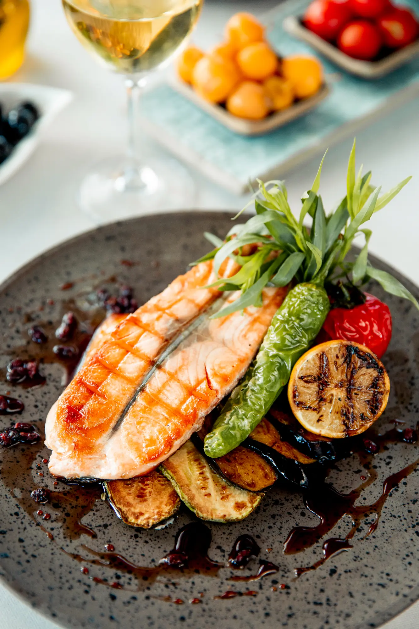 Lachsfilet gegrillt in Lugana – Safransauce, mit Beilage